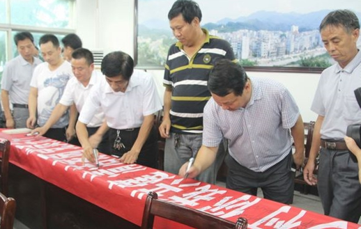 为扎实推进美丽乡村建设,罗田县胜利镇党委、政府在全镇发动千余名党员干部举行签名活动,使党员干部们自觉行动起来,成为美丽乡村、清洁家园建设的先行者。图为7月20日晚,参加镇干部夜校学习的党员干部们纷纷在宣传横幅上签下了自己的名字。(信息员:曾宪华)