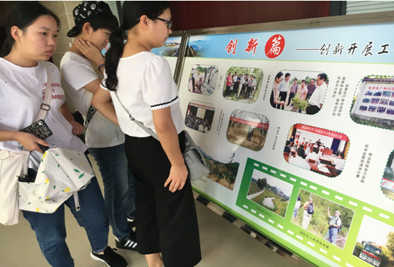 在林业局工作人员带领下,她们参观了县林业局大厅摆放的宣传展板,并与具体负责绿色示范乡村工作的雷潇主任进行了深度访谈。在访谈中,她们实地了解了罗田县申报评选湖北省绿色示范乡村情况。罗田县 "绿满罗田"项目是在2014年实施的,目标是三年内绿化任务量达五万多亩,具体包括山地、乡村、道路绿化和义务植树等活动,营造"城在林中、路在景中、人在绿中"的生态格局。"绿满罗田"受到全县上下的普遍关注和积极参与,已建成57个湖北省"绿色示范乡村"。自此,罗田城乡实现了绿色全覆盖,并且了解到罗田县县委、县政府将继续加快推进"绿化模范乡镇"和"绿色示范乡村"建设。